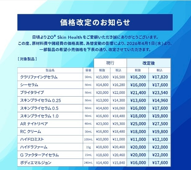 2026年4月1日より、ゼオスキンヘルスの一部製品価格が改定されます。